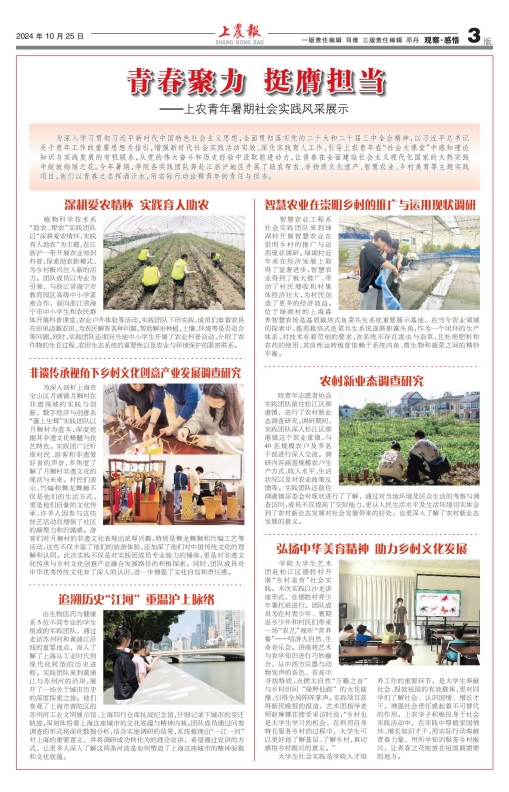 为深入学习贯彻习近平新时代中国特色社会主义思想,全面贯彻落实党的二十大和二十届三中全会精神,以习近平总书记关于青年工作的重要思想为指引,增强新时代社会实践活动实效、深化实践育人工作,引导上农青年在“社会大课堂”中感知理论知识与实践发展的有机联系,从党的伟大奋斗和历史经验中汲取前进动力,让青春在全面建设社会主义现代化国家的火热实践中绽放绚丽之花。今年暑期,学院各实践团队奔赴江浙沪地区开展了助农帮农、非物质文化遗产、智慧农业、乡村美育等主题实践项目,他们以青春之名挥洒汗水,用实际行动诠释青年的责任与担当。