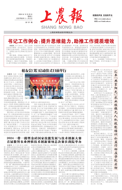 本报讯 为进一步加强校友与母校以及校友之间的沟通和交流、服务与合作,共同推动学校事业的高质量发展。12月14日,上海农林职业技术学院(上海市农业学校)校友会(筹)启动仪式举行。来自不同地区、不同领域的20余位校友聚集一堂,学院党政班子出席。仪式由副院长(副校长)费国强主持。