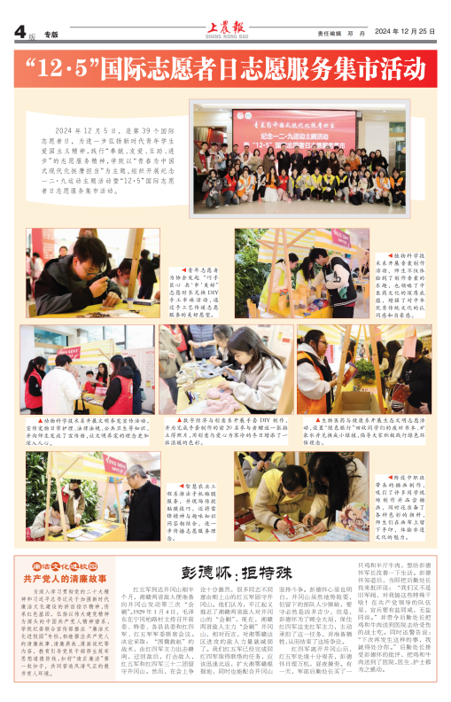 红四军离开井冈山后,红五军处境十分艰苦,彭德怀日理万机,昼夜操劳。有一天,军部后勤处长买了一只鸡和半斤牛肉,想给彭德怀军长改善一下生活。彭德怀知道后,当即把后勤处长找来批评说:“我们又不是旧军阀,对我搞这些特殊干啥!在共产党领导的队伍里,官兵要有盐同咸,无盐同淡。”并责令后勤处长把鸡和牛肉送到医院去给受伤的战士吃。同时还警告说:“下次再发生这样的事,我就得处分你。”后勤处长接受彭德怀的批评,把鸡和牛肉送到了医院,医生、护士都为之感动。