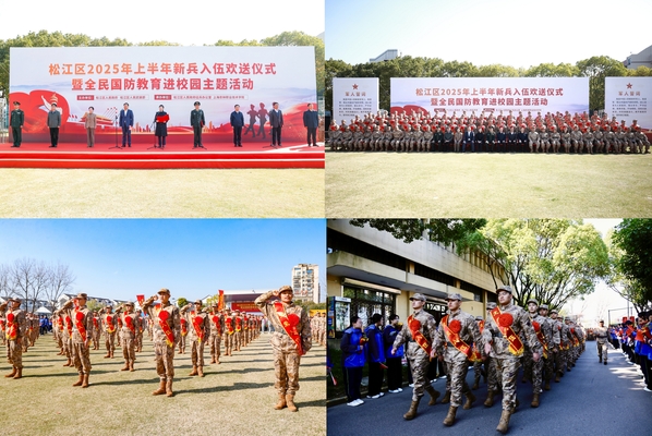 3月17日,松江区2025年上半年新兵入伍欢送仪式在我院举行,87名新兵身着迷彩服、肩佩绶带、胸戴红花接受检阅。区委副书记王靖、区人武部部长周晓光等领导出席,与新兵家属及师生共同见证。仪式上,周晓光宣读入伍名单,王靖勉励新兵为国防事业建功立业;新兵代表誓言不负使命,家长寄语支持。现场还举行了授旗、合影等环节,展现青春报国热情。今年我院43名学子应征入伍,超额完成征兵任务。