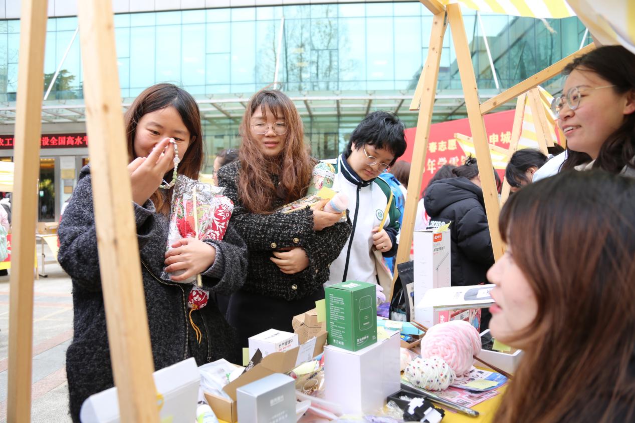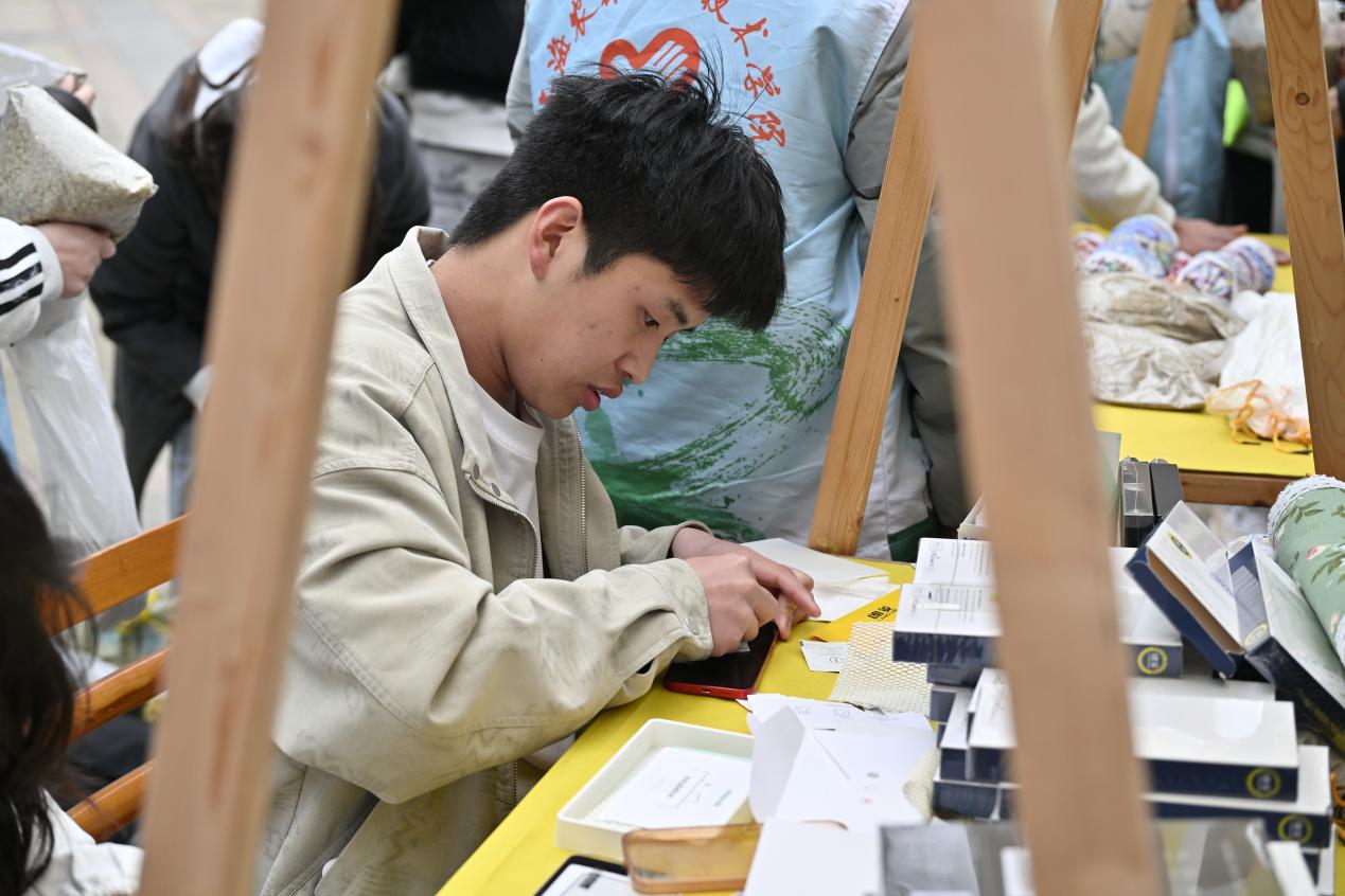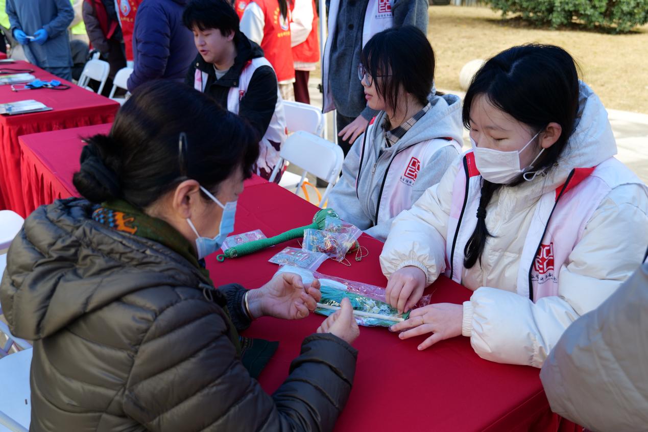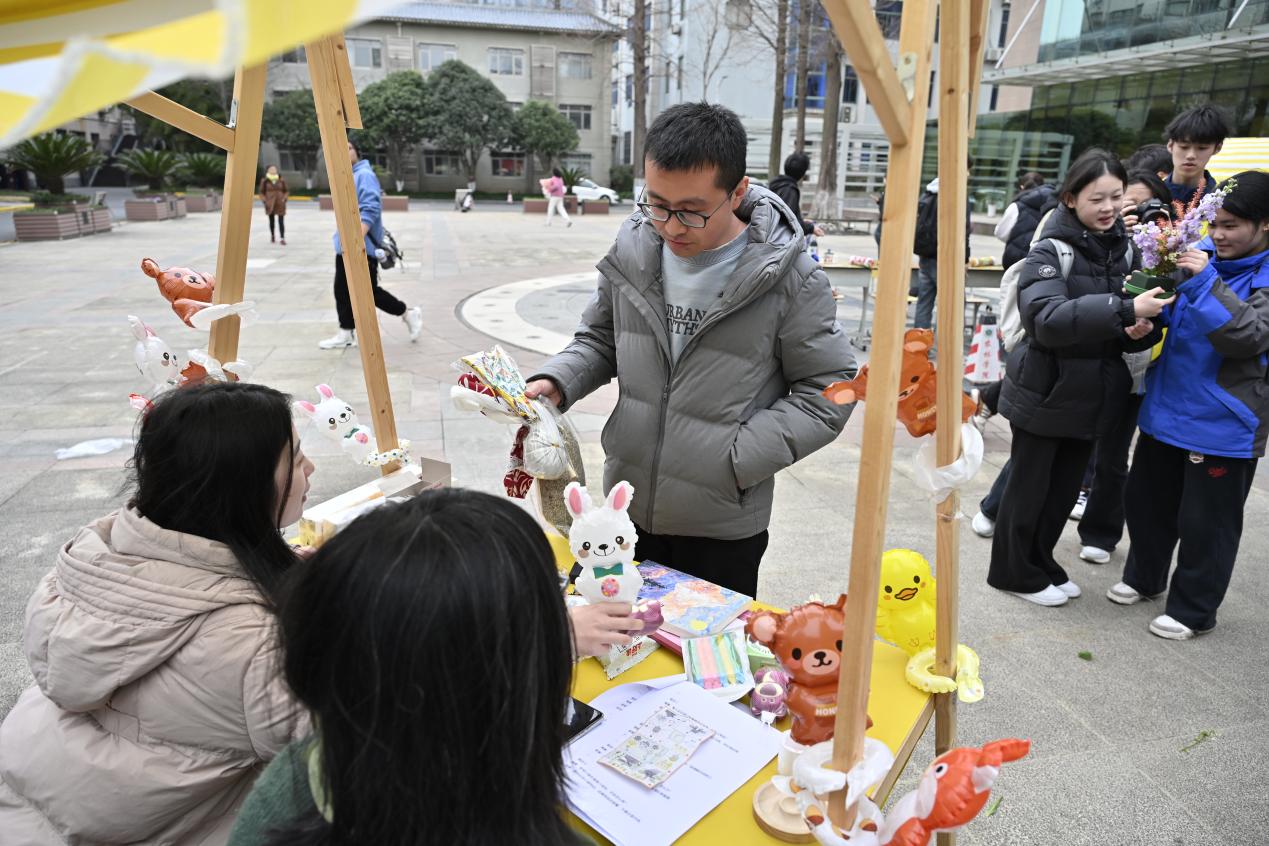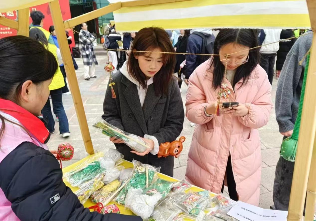 数字经济与创意系推出的“传承雷锋精神,共筑绿色梦想”活动,吸引了众多师生驻足。摊位设置塑料瓶、旧书籍等可回收物兑换香囊包,以及志愿者凭100小时服务时长兑换艾草锤的活动。