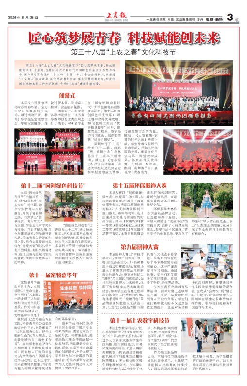 第三十八届“上农之春”文化科技节以“匠心筑梦展青春,科技赋能创未来”为主题,坚持以习近平新时代中国特色社会主义思想为指导,深入学习贯彻党的二十大和二十届二中、三中全会精神,扎实推进“三全育人”综合改革,深化思政教育内涵,强化科技创新能力,形成校园文化铸魂育人的良好氛围,为学院“双高”建设贡献力量。