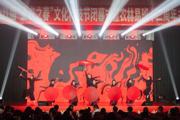 同期举行了“‘易’路繁花十二载,尚农‘网’育新生态”农林易班十二周年主题活动。微电影《青春接力》拉开活动序幕,讲述大学生从迷茫到坚定参军报国的成长故事,传递理想信念的力量。随后,《云赏雅集・衣裳的时光之旅》精彩上演,学生身着汉服展示非遗作品,并融入环保服饰走秀,彰显文化自信与第二课堂教学成果。各系部带来歌伴舞、心理剧、配音秀、朗诵、街舞等节目,展现学子青春活力。