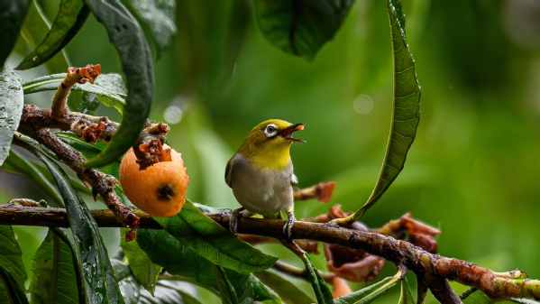 作品简介:绣眼鸟银环状的眼眸凝神注视,喙尖停留着刚啄下的金黄枇杷,枝叶上的雨露折射出剔透的光斑。暗绿色背景中浮动着金黄色色果实,鸟羽的渐变与果实的橙黄形成撞色。画面定格在鸟儿啄破果皮,果肉还未吞下的刹那,凝固了夏季特有的温润感与生命能量的传递瞬间。