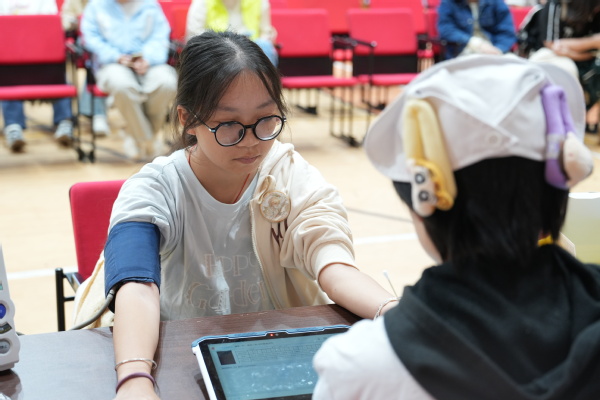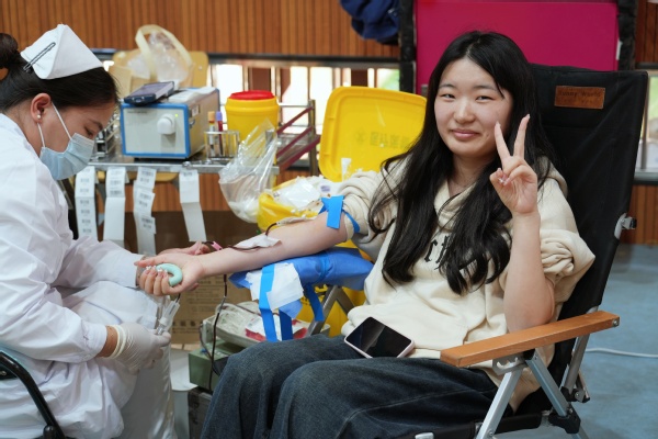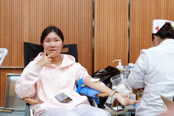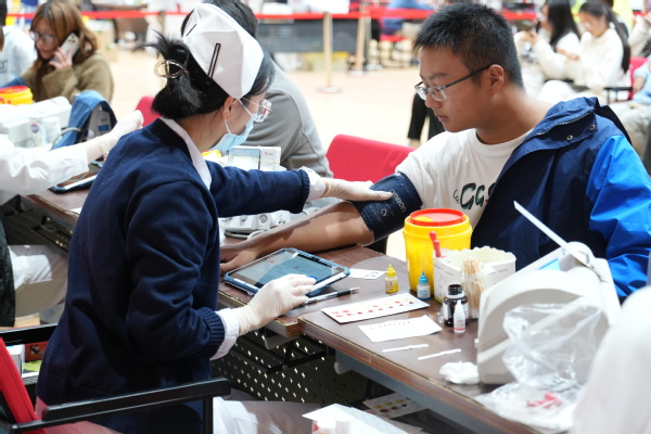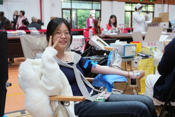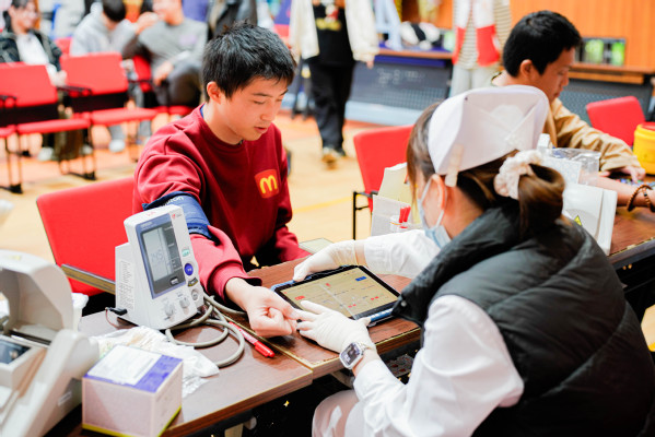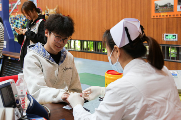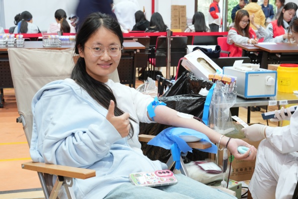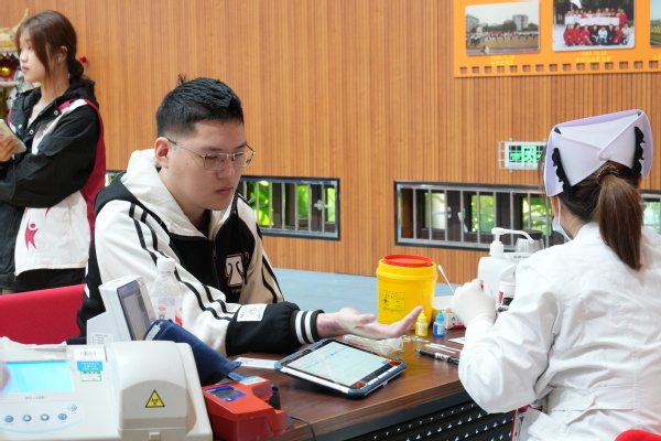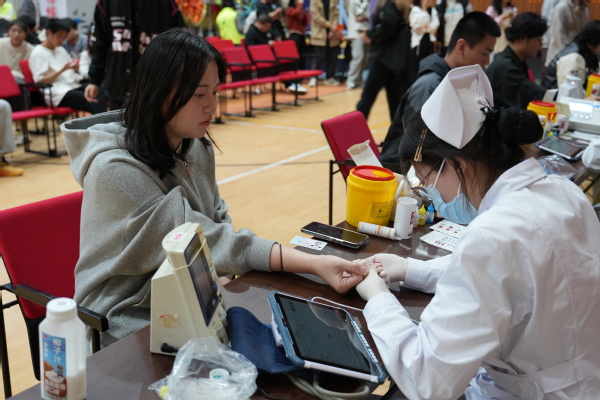 献血当天,师生有序在等候区、体检区、献血区及休息区间流动。今年首次推行无纸化登记,师生提前扫码完成报名。现场直接核验通过,高效又环保。在志愿者和医护人员的指引下,大家依次完成健康问询、血压测量、血液化验等环节。体检合格后,师生挽袖,伸出手臂,让“热血”悄然流淌,汇聚成托举生命的希望之力。