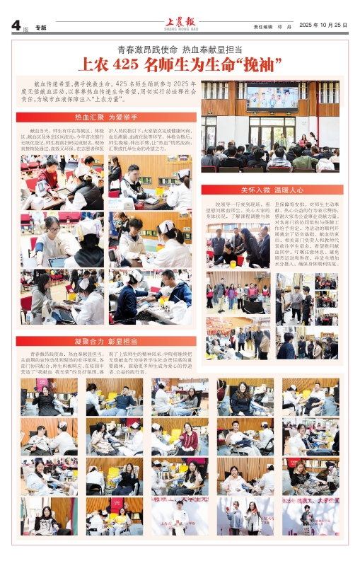 青春激昂践使命,热血奉献显担当。425名师生踊跃参与2025年度无偿献血活动,以拳拳热血传递生命希望,用切实行动诠释社会责任,为城市血液保障注入“上农力量”。