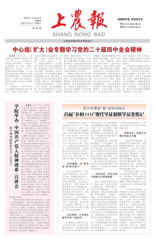 本报讯 12月4日,上海农林职业学院举行理论学习中心组(扩大)会,以专题学习形式深入贯彻党的二十届四中全会精神,进一步统一思想、凝聚共识,为学院“十五五”时期高质量发展蓄能。学习会特邀上海交通大学研究员王昆博士作辅导报告,学院党政领导班子、全体中层干部参会,党委书记蔡红主持会议并部署落实工作。