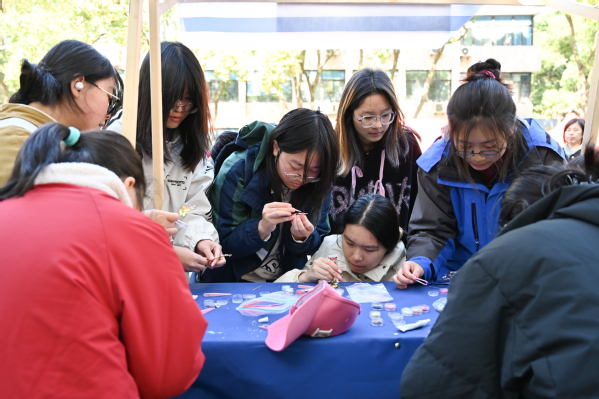 多彩活动与生活服务区集中呈现了各系志愿服务团队的创意与匠心。艺术插花、传统刺绣、创意彩绘等活动展现了指尖的艺术;超声波清洗眼镜、免费手机贴膜、专业美妆修眉等活动提供了实实在在的便民服务。
