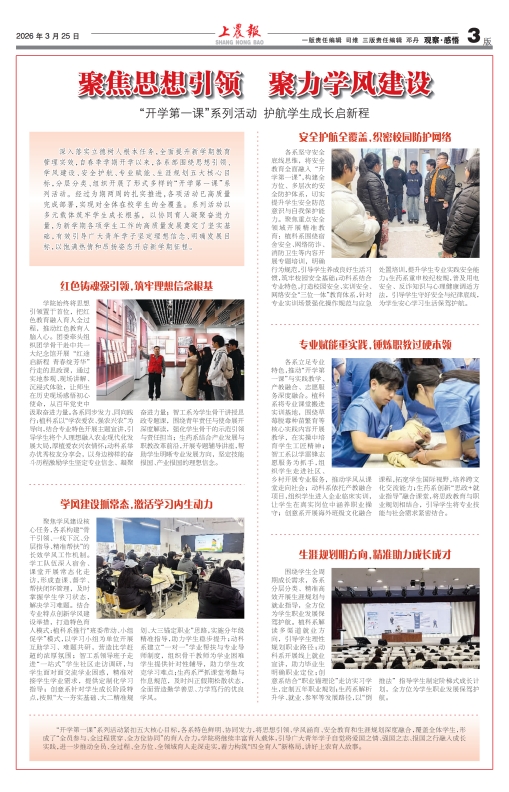 深入落实立德树人根本任务,全面提升新学期教育管理实效,自春季学期开学以来,各系部围绕思想引领、学风建设、安全护航、专业赋能、生涯规划五大核心目标,分层分类、组织开展了形式多样的“开学第一课”系列活动。经过为期两周的扎实推进,各项活动已高质量完成部署,实现对全体在校学生的全覆盖。系列活动以多元载体筑牢学生成长根基,以协同育人凝聚奋进力量,为新学期各项学生工作的高质量发展奠定了坚实基础,有效引导广大青年学子坚定理想信念、明确发展目标,以饱满热情和昂扬姿态开启新学期征程。