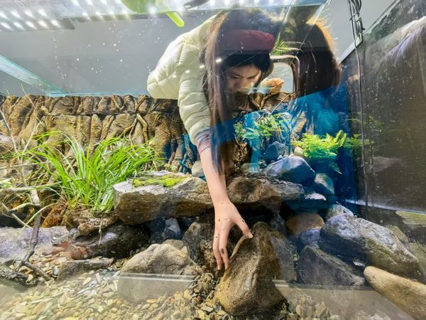 学校2016级宠物养护与驯导专业毕业生成贞烈,现任科普展示支持组组长。她不仅负责生态养殖、物种管护、水质调控与健康保障,还承担着科普布展、展区运维及设备巡检工作。“我们不仅是保育员,更是生态理念的传播者。”成贞烈说。她亲自设计、布置、维护长江流域生境模拟系列展示缸组,达到了“水要清、鱼要活、植物有生机、处处是亮点”的工作要求,展示有水生生物86种、650余只/株,已经成为中心科普馆的一大亮点,得到了国内外同行的一致好评。在她的努力下,市水野中心的科普馆成为公众了解长江生态的重要窗口,年均接待参观者数万人次,有效提升了公众水生生态保护意识。
